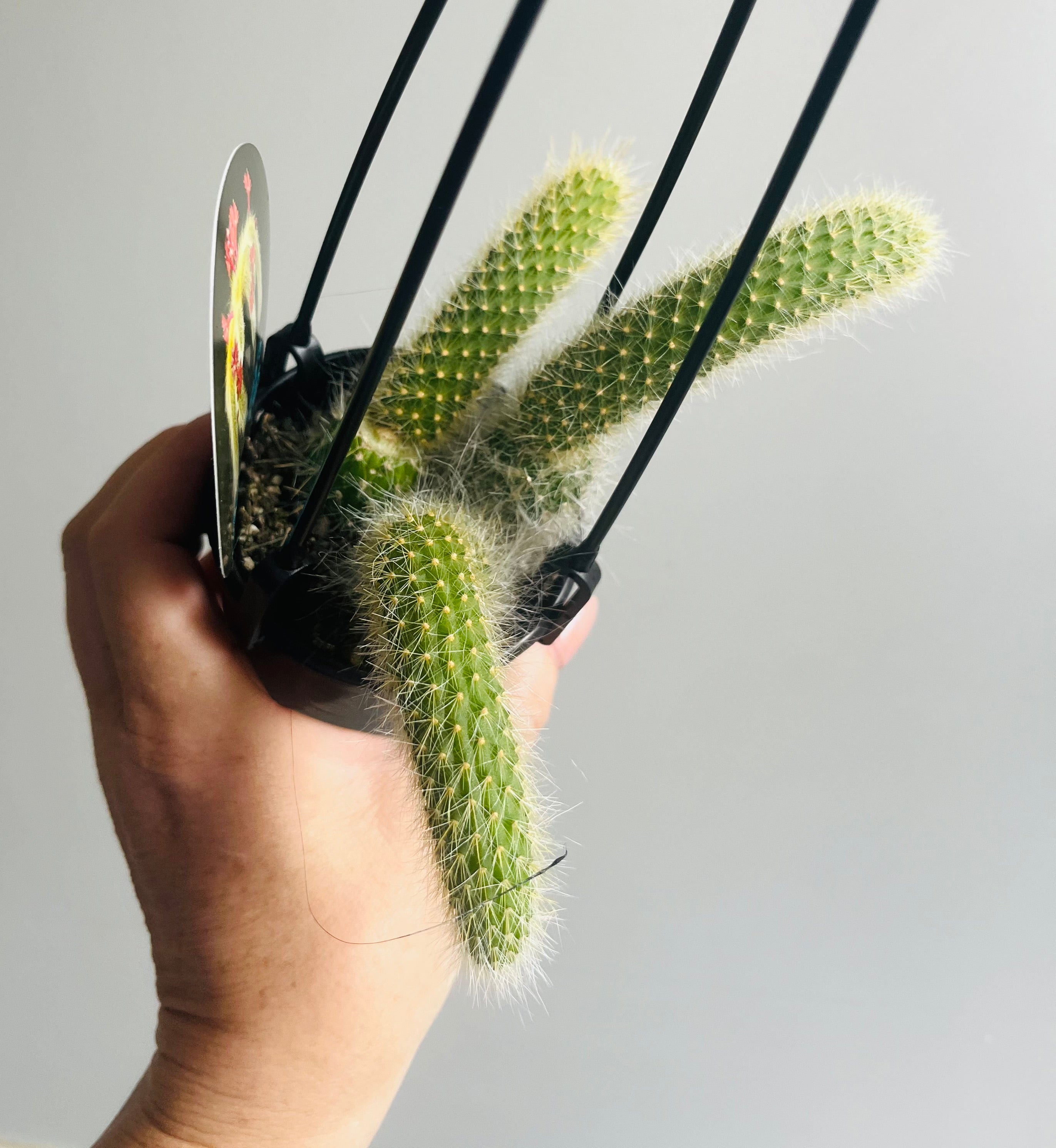 A Monkey Tail Cactus is a great plant for beginners. It has long, white, soft, hair like spines and gets large bright red flowers. It looks best in hanging baskets.